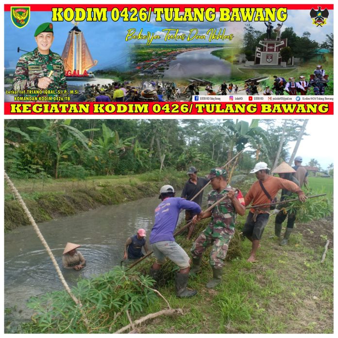 KODIM 0426/TB- Rawajitu Utara (Mesuji) – Babinsa Koramil 426-03 Rawajitu Kodim 0426 Tulang Bawang Serka Exnasius, melaksanakan kegiatan gotong royong bersama kelompok tani Didesa Sidang Kurnia Agung, Kecamatan Rawajitu Utara Kabupaten Mesuji, Senin 30 Januari 2023.