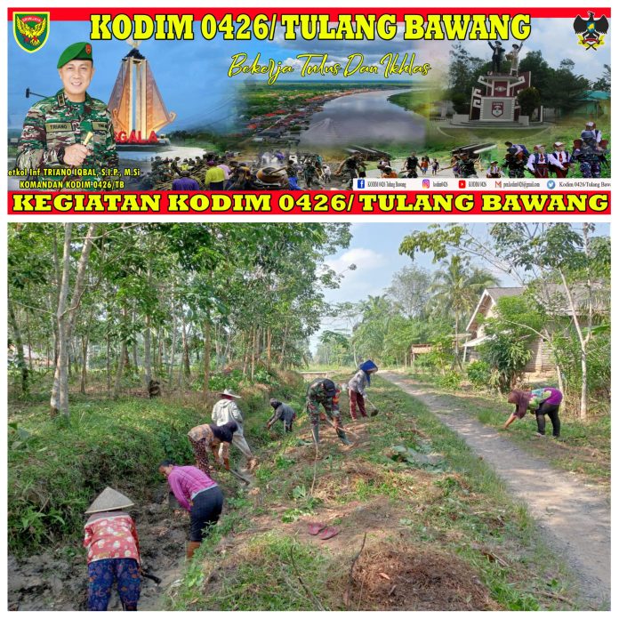 KODIM 0426/TB- Mesuji Timur (Mesuji) — Babinsa Koramil 426-01 Simpang Pematang Kodim 0426 Tulang Bawang Serma Burhanudin, melaksanakan kegiatan gotong royong bersama warga Desa Eka Mulya, Kecamatan Mesuji Timur, Kabupaten Mesuji, Sabtu 06 Mei 2023.