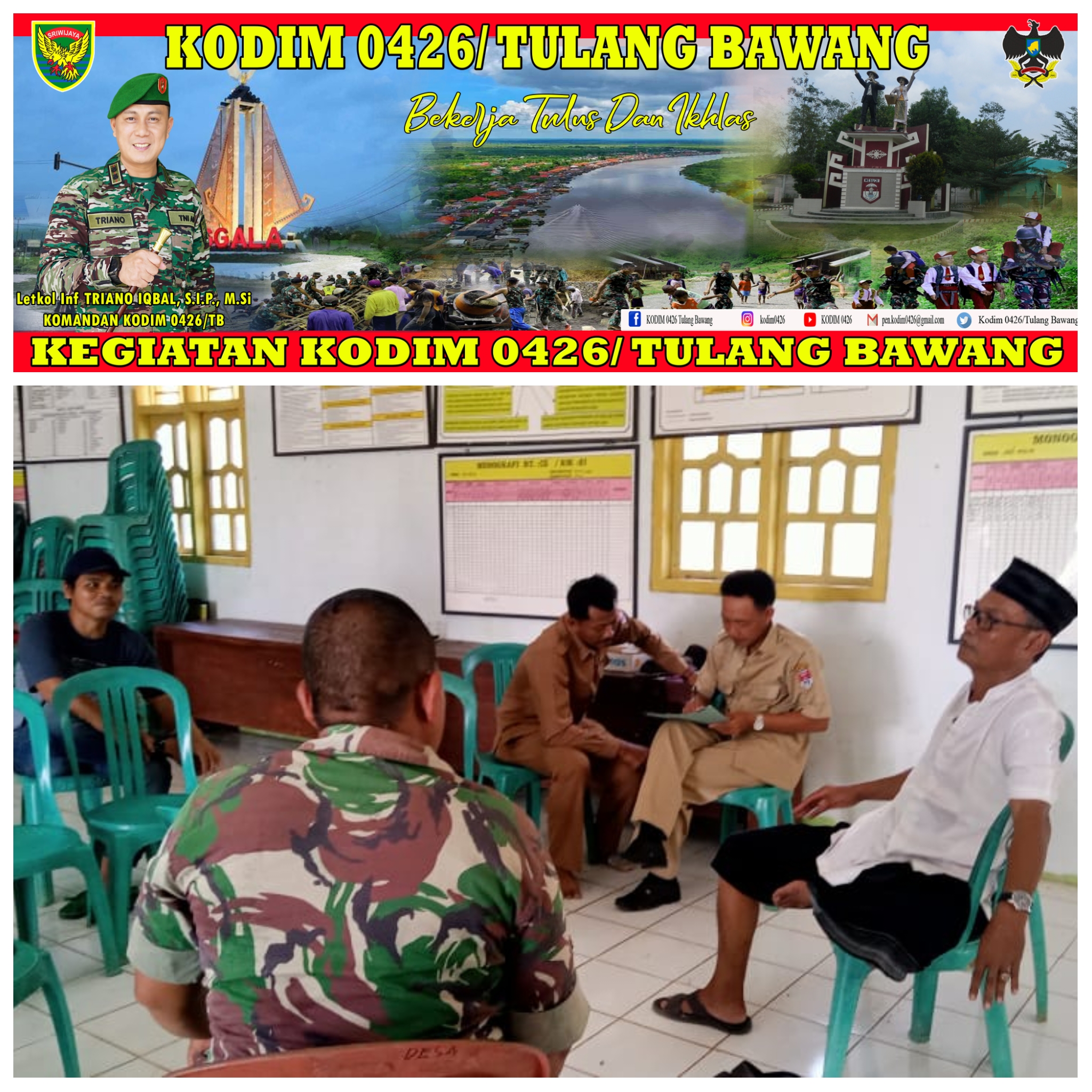 KODIM 0426/TB- Panca Jaya (Mesuji) — Babinsa Koramil 426-01 Simpang Pematang Kodim 0426 Tulang Bawang Sertu Ahmad Najmi melaksanakan kegiatan anjangsana dengan Aparatur Desa, Didesa Adhi Mulyo Kecamatan Panca Jaya, Kabupaten Mesuji Kamis 30 Maret 2023.
