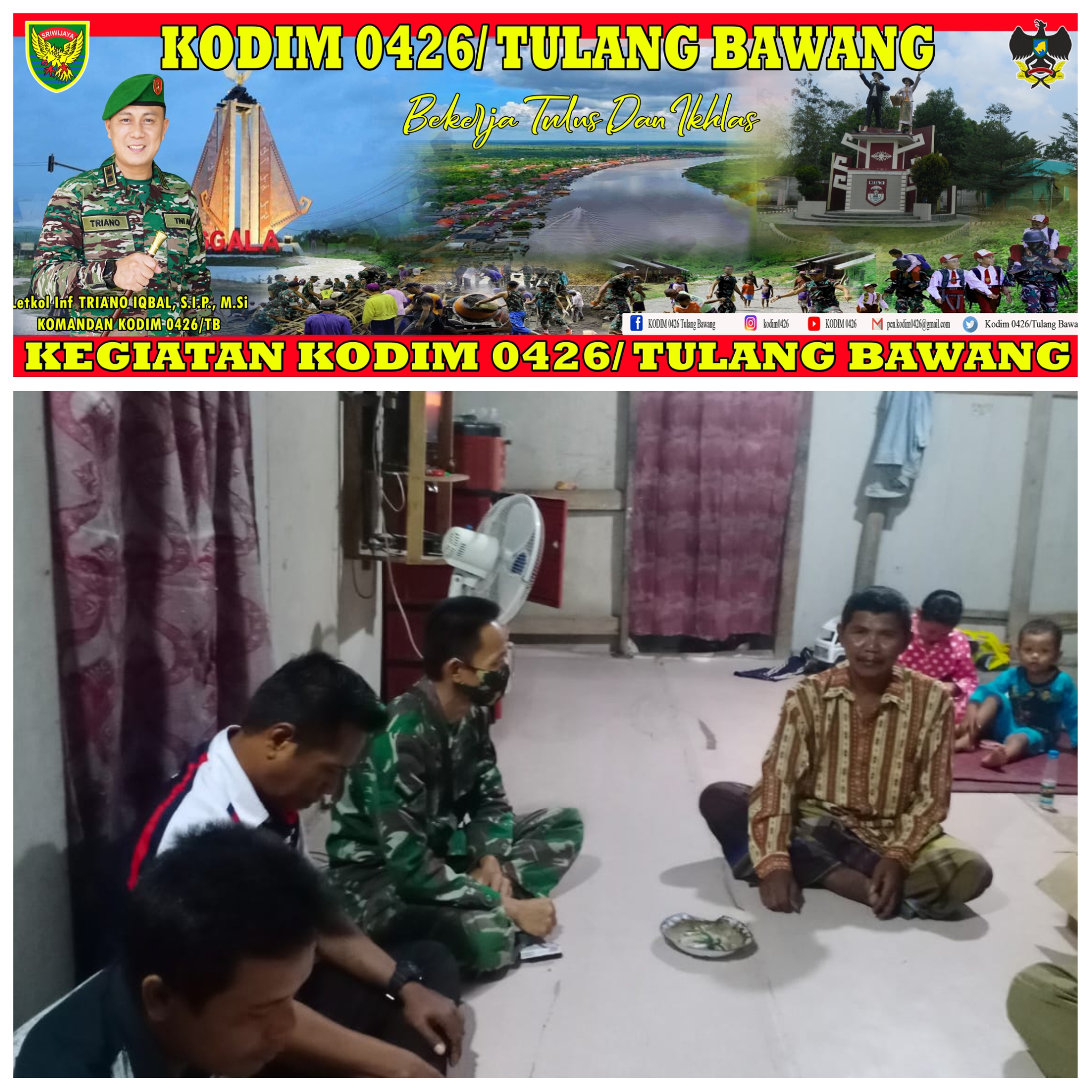 KODIM 0426/TB- Rawa Pitu (Tulang Bawang) — Anggota Koramil 426-05 Penawar Aji, Kodim 0426 Tulang Bawang itu mendatangi setiap warga kampung binaannya, Kampung Gedung Jaya, Kecamatan Rawa Pitu, Kabupaten Tulang Bawang.