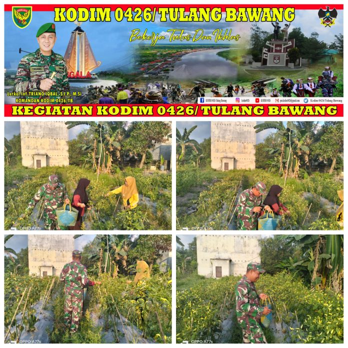 KODIM 0426/TB- Babinsa Koramil 426-03 Rawajitu, Kodim 0426 Tulang Bawang, Sertu Budiman, dampingi petani panen cabe di Kampung Wono Agung, Kabupaten Tulang Bawang, Kamis 31 Agustus 2023.