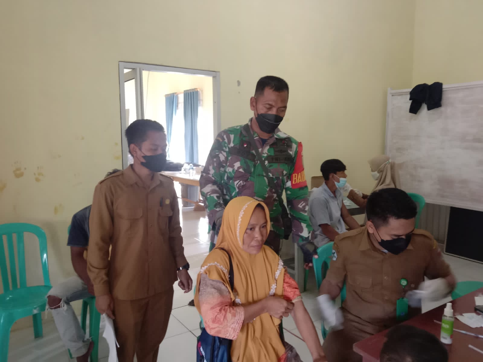 BKODIM 0426/TB- MESUJI: Babinsa Koramil 426-01 Simpang Pematang Sertu Roy Martin memantau pelaksanaan serbuan Vaksinasi Covid-19, di Balai Desa Mekar Sari, Kecamatan Tanjung Raya, Kabupaten Mesuji Lampung, Selasa(25/1/2022).