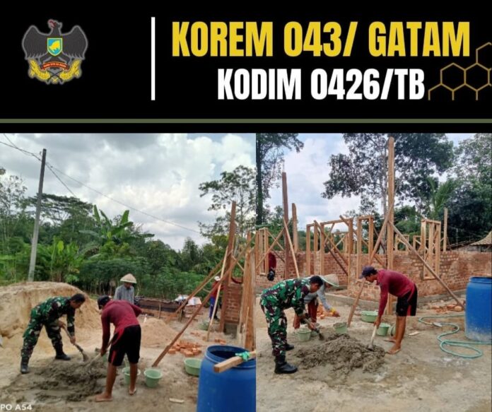 KODIM 0426/TB – – Gedung Aji (Tulang Bawang) — Wujud kepedulian TNI terhadap masyarakat kembali ditunjukkan oleh Sertu Siswanto, Babinsa Koramil 426-05 Penawar Aji (PA), Kodim 0426 Tulang Bawang. Ia terjun langsung bersama warga melaksanakan gotong royong pembangunan rumah salah satu warga di Kampung Aji Jaya KNPI, Kecamatan Gedung Aji, Kabupaten Tulang Bawang, pada Jum’at 06 Februari 2026.