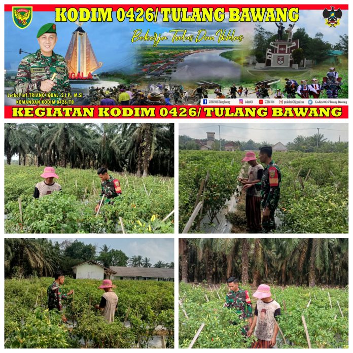 KODIM 0426/TB- Penawar Aji (Tulang Bawang) — Babinsa Koramil 426-05/PA Kodim 0426 Tulang Bawang, dalam rangka meningkatkan ketahanan pangan di wilayah binaan, Praka Hardian mendampingi petani yang sedang memanen cabe merah di Kampung Panca Tunggal Jaya, Kecamatan Penawar Aji, Kabupaten Tulang Bawang, Minggu 08 Oktober 2023.