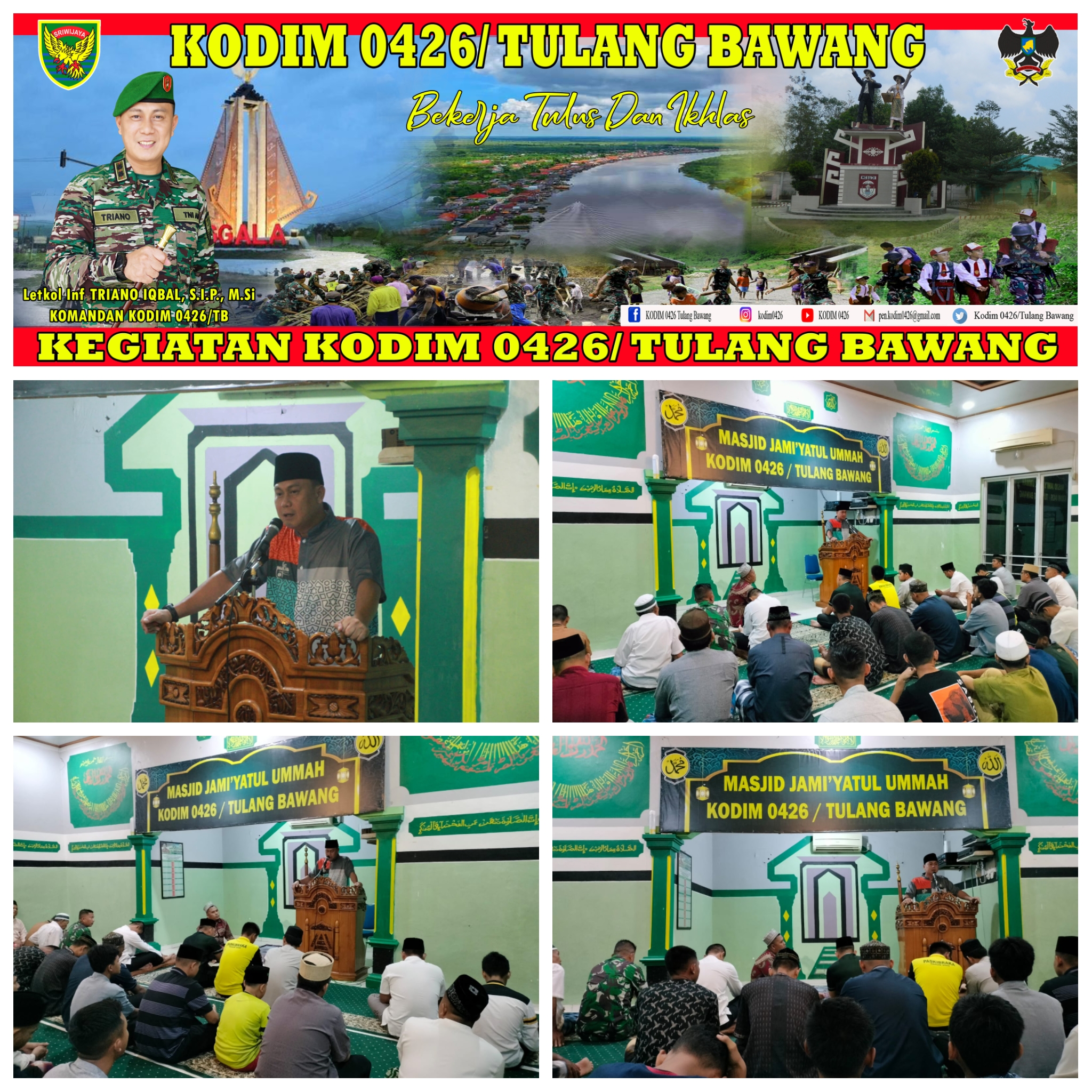 KODIM 0426/TB- Menggala (Tulang Bawang) — Komandan Kodim 0426 Tulang Bawang Letkol Inf Triano Iqbal, S.I.P., M.Si, memberikan Tausiah pada malam satu Ramadhan 1444 Hijriah Masehi di Masjid Jamiyatul Ummah Makodim, Jln. Lintas Timur Sumatra, Km. 113, Kampung Bujung Tenuk, Kecamatan Menggala, Kabupaten Tulang Bawang, Rabu Malam 22 Maret 2023.
