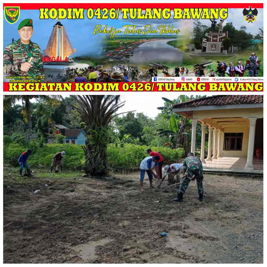KODIM 0426/TB- Penawar Aji (Tulang Bawang) – Peltu Suyani Babinsa koramil 426-05 Penawar Aji, Kodim 0426 Tulang Bawang., Melaksanakan Gotong Royong di bersama Perangkat Kampung dan warga Desa binaan, di Halaman Balai Kampung Gedung Harapan, Kecamatan Penawar Aji, Kabupaten Tulang Bawang, Minggu (11/12/2022).
