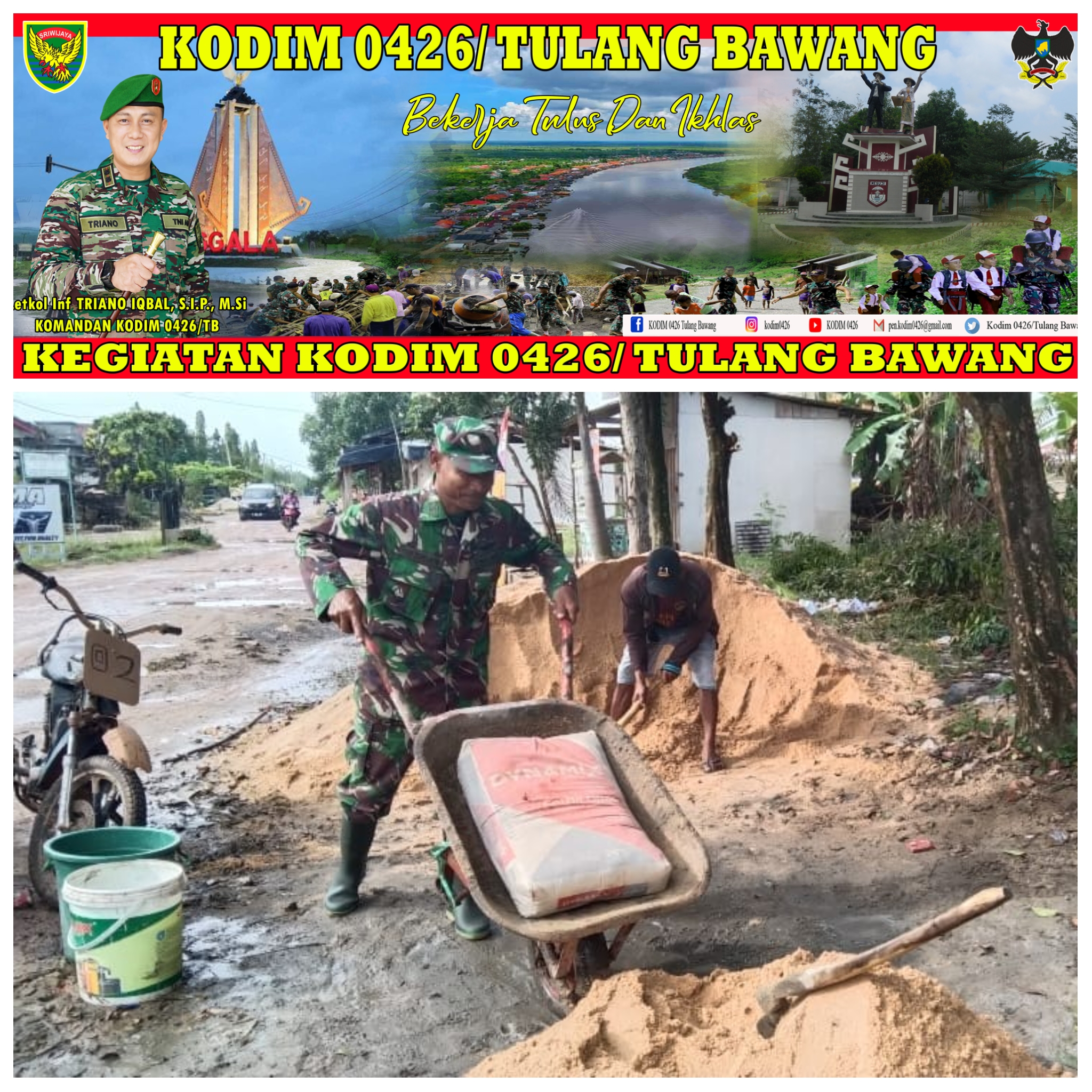 KODIM 0426/TB- Rawajitu Utara (Mesuji) — Babinsa Koramil 426-03 Rawajitu Kodim 0426 Tulang Bawang wujud kepedulian Babinsa Pelda Muridan bantu warga dalam proses pembuatan batu batako sebagai aparat kewilayahan di tengah masyarakat, Senin 10 April 2023.